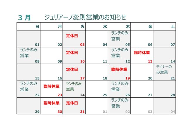 名古屋市緑区イタリアンジュリアーノ3月営業カレンダー(最新版)